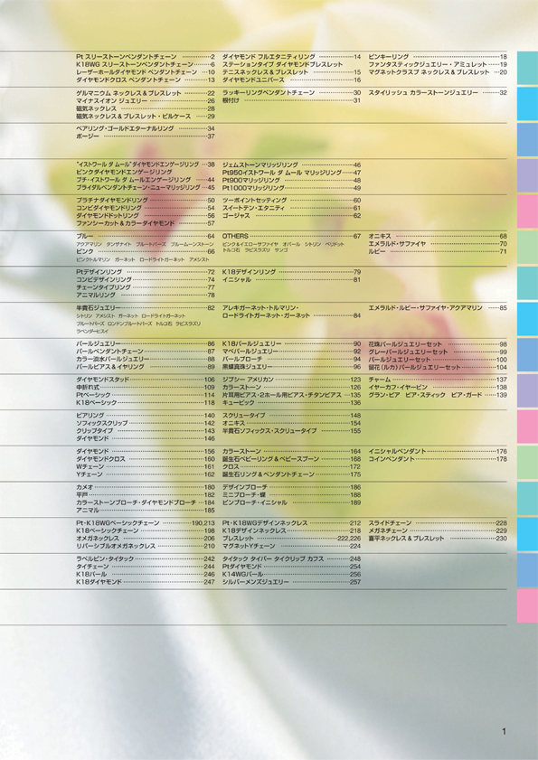 P.0 表紙 P.1 目次(目次一覧↓) ジュエリー イン ファッション ■ Pt スリーストーン ペンダントチェーン P.2 1.5ct エクセレントカット P.3 4本爪スタンダードセッティング グラデーションタイプ P.4 4本爪スタンダードセッティング ストレートタイプ ニューベーシック サイドリンクタイプ P.5 ツーポイントセッティング ストレートタイプ グラデーションタイプ ■ K18WG スリーストーン ペンダントチェーン P.6 ステーションタイプ スウィングレスタイプ P.7 スパイラルタイプ リフレクションタイプ ハート&フラワー P.8 エレガントタイプ ウェーヴタイプ スウィングタイプ P.9 4本爪スタンダードセッティング スウィングレスタイプ ツーポイントセッティング ウェーヴタイプ ■ レーザーホールダイヤモンド ペンダントチェーン P.10 レーザーホール スリーストーン シンプル 2WAY P.11 レーザーホール スリーストーン・トリプルサークル ハートモチーフ キスマークモチーフ P.12 シンプルシェイプ リーフ(木の葉)モチーフ ■ ダイヤモンドハイジュエリー P.13 Pt・K18WG ダイヤモンドクロス ペンダントチェーン P.14 ダイヤモンドフルエタニテ リング ステーションタイプブレスレット P.15 テニスネックレス&ブレスレット P.16 ダイヤモンドユニバース P.17 ダイヤモンドユニバース ■ ジュエリーインファッション P.18 ピンキーリング P.19 ファンタスティックジュエリー アミュレット(お守り)ジュエリー P.20 コンバーチブルタイプ マグネットクラスプネックレス P.21 マグネットクラスプブレスレット ■ ヘルシー&ラッキージュエリー P.22 シルバーゲルマニウム ネックレス&ブレスレット P.23 ゲルマニウム・プレーティング SVネックレス&ブレスレット P.24 ゲルマニウム・プレーティング SV喜平ネックレス&ブレスレット P.25 ゲルマニウム・プレーティング チタンネックレス P.26 マイナスイオンジュエリー P.27 マイナスイオンジュエリー P.28 エポールK18磁気ネックレス P.29 エポール磁気ブレスレット &ネックレス ピルケース P.30 ラッキーリングペンダントチェーン P.31 根付け ■ ジュエリー イン ファッション P.32 スタイリッシュ カラーストーンジュエリー P.33 スタイリッシュ カラーストーンジュエリー(つづき) ■ ペア&ポージー P.34 ペアリング ゴールドエターナルリング P.35 ペアリング P.36 ペアリング ペアポージー P.37 ポージー ■ ブライダルジュエリー P.38 【イストワール ダ ムール】 ダイヤモンドエンゲージリング P.39 ↑つづき P.40 ↑つづき P.41 ↑つづき P.42 ↑つづき P.43 ↑つづき P.44 ピンクダイヤモンド エンゲージリング プチ・イストワールダムール エンゲージリング P.45 ブライダルペンダントチェーン ニューマリッジリング P.46 ジェムストーンマリッジリング P.47 Pt950イストワールダムール マリッジリング P.48 Pt900マリッジリング P.49 Pt1000マリッジリング ■ ダイヤモンドデザインリング P.50 プラチナダイヤモンドリング P.51 プラチナダイヤモンドリング P.52 プラチナダイヤモンドリング P.53 コンビダイヤモンドリング P.54 コンビダイヤモンドリング P.55 コンビダイヤモンドリング P.56 ダイヤモンド・ドット・リング P.57 ファンシーカット &カラーダイヤモンド P.58 ダイヤモンドモチーフ &パヴェリング P.59 ダイヤモンドモチーフ &パヴェリング P.60 ツーポイントセッティング P.61 スイートテン エタニティ P.62 ゴージャス P.63 ゴージャス ■ カラーストーンデザインリング ブルー P.64 アクアマリン タンザナイト P.65 ブルートパーズ ブルームーンストーン ピンク P.66 ピンクトルマリン ガーネット ロードライトガーネット アメシスト Other P.67 ピンク&イエローサファイヤ オパール シトリン ペリドット トルコ石 ラピスラズリ サンゴ P.68 オニキス P.69 オニキス P.70 エメラルド サファイヤ P.71 ルビー ■ デザインリング P.72 Ptデザインリング P.73 Ptデザインリング P.74 コンビデザインリング P.75 ミラーカットリング P.76 スリーカラーリング P.77 チェーンタイプリング P.78 アニマルリング P.79 K18デザインリング P.80 K18デザインリング P.81 イニシャルリング ■ カラーストーンジュエリー P.82 半貴石ジュエリー P.83 半貴石ジュエリー P.84 アレキガーネット トルマリン ロードライトガーネット ガーネット P.85 エメラルド ルビー サファイヤ アクアマリン ■ パールジュエリー P.86 パールジュエリー P.87 パールペンダントチェーン P.88 カラー淡水パールジュエリー P.89 パールピアス&イヤリング P.90 K18パールジュエリー P.91 K18パールジュエリー P.92 マベパールジュエリー P.93 マベパールジュエリー P.94 パールブローチ P.95 パールブローチ P.96 黒蝶真珠ジュエリー P.97 黒蝶真珠ブローチ P.98 花珠パールジュエリー2点セット P.99 グレーパールセット P.100 パールジュエリーセット P.101 パールジュエリーセット P.102 パールジュエリーセット P.103 パールジュエリーセット P.104 「留花(ルカ)」パールセット P.105 「留花(ルカ)」グレーパールセット ■ ピアス P.106 ダイヤモンドスタッド 