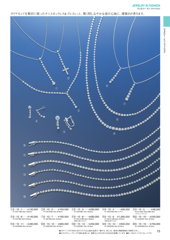 P.0 表紙 P.1 目次(目次一覧↓) ジュエリー イン ファッション ■ Pt スリーストーン ペンダントチェーン ■ K18WG スリーストーン ペンダントチェーン ■ レーザーホールダイヤモンド ペンダントチェーン ■ ダイヤモンドハイジュエリー P.13 Pt・K18WG ダイヤモンドクロス ペンダントチェーン P.14 ダイヤモンドフルエタニテ リング ステーションタイプブレスレット P.15 テニスネックレス &ブレスレット P.16 ダイヤモンドユニバース P.17 ダイヤモンドユニバース ■ ジュエリーインファッション ■ ヘルシー&ラッキージュエリー ■ ジュエリー イン ファッション ■ ペア&ポージー ■ ブライダルジュエリー ■ ダイヤモンドデザインリング ■ カラーストーンデザインリング ■ デザインリング ■ カラーストーンジュエリー ■ パールジュエリー ■ ピアス ■ イヤリング ■ ブローチ ■ ネックレス&ブレスレット ■ メンズジュエリー