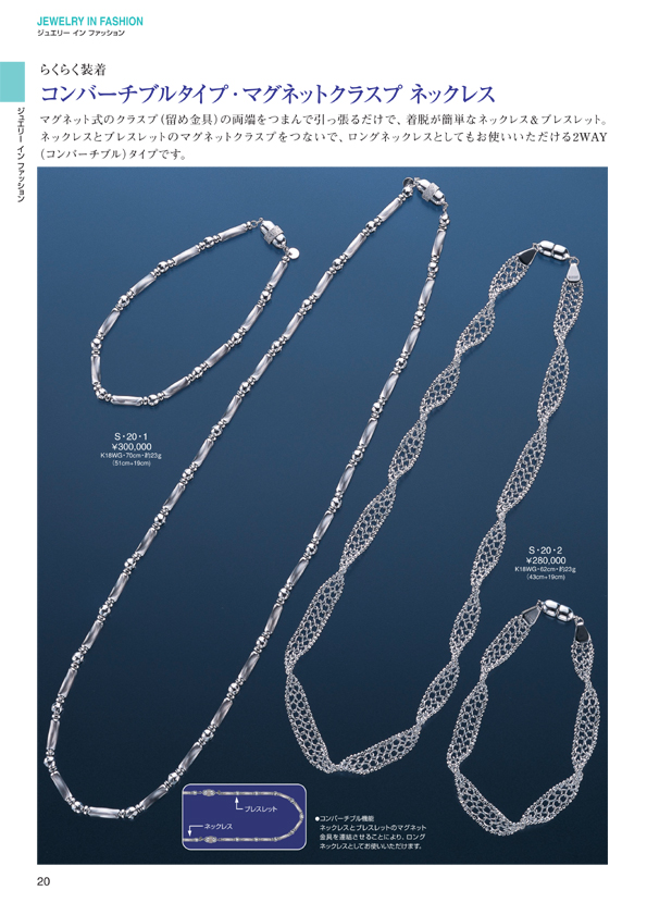 P.0 表紙 P.1 目次(目次一覧↓) ジュエリー イン ファッション ■ Pt スリーストーン ペンダントチェーン ■ K18WG スリーストーン ペンダントチェーン ■ レーザーホールダイヤモンド ペンダントチェーン ■ ダイヤモンドハイジュエリー ■ ジュエリーインファッション P.18 ピンキーリング P.19 ファンタスティックジュエリー アミュレット(お守り)ジュエリー P.20 コンバーチブルタイプ マグネットクラス プネックレス P.21 マグネットクラスプブレスレット ■ ヘルシー&ラッキージュエリー ■ ジュエリー イン ファッション ■ ペア&ポージー ■ ブライダルジュエリー ■ ダイヤモンドデザインリング ■ カラーストーンデザインリング ■ デザインリング ■ カラーストーンジュエリー ■ パールジュエリー ■ ピアス ■ イヤリング ■ ブローチ ■ ネックレス&ブレスレット ■ メンズジュエリー
