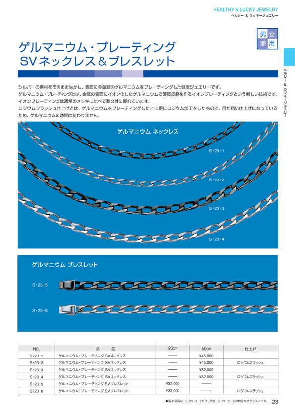 P.0 表紙 P.1 目次(目次一覧↓) ジュエリー イン ファッション ■ Pt スリーストーン ペンダントチェーン ■ K18WG スリーストーン ペンダントチェーン ■ レーザーホールダイヤモンド ペンダントチェーン ■ ダイヤモンドハイジュエリー ■ ジュエリーインファッション ■ ヘルシー&ラッキージュエリー P.22 シルバーゲルマニウム ネックレス&ブレスレット P.23 ゲルマニウム プレーティング SVネックレス &ブレスレット P.24 ゲルマニウム・プレーティング SV喜平ネックレス&ブレスレット P.25 ゲルマニウム・プレーティング チタンネックレス P.26 マイナスイオンジュエリー P.27 マイナスイオンジュエリー P.28 エポールK18磁気ネックレス P.29 エポール磁気ブレスレット &ネックレス ピルケース P.30 ラッキーリングペンダントチェーン P.31 根付け ■ ジュエリー イン ファッション ■ ペア&ポージー ■ ブライダルジュエリー ■ ダイヤモンドデザインリング ■ カラーストーンデザインリング ■ デザインリング ■ カラーストーンジュエリー ■ パールジュエリー ■ ピアス ■ イヤリング ■ ブローチ ■ ネックレス&ブレスレット ■ メンズジュエリー