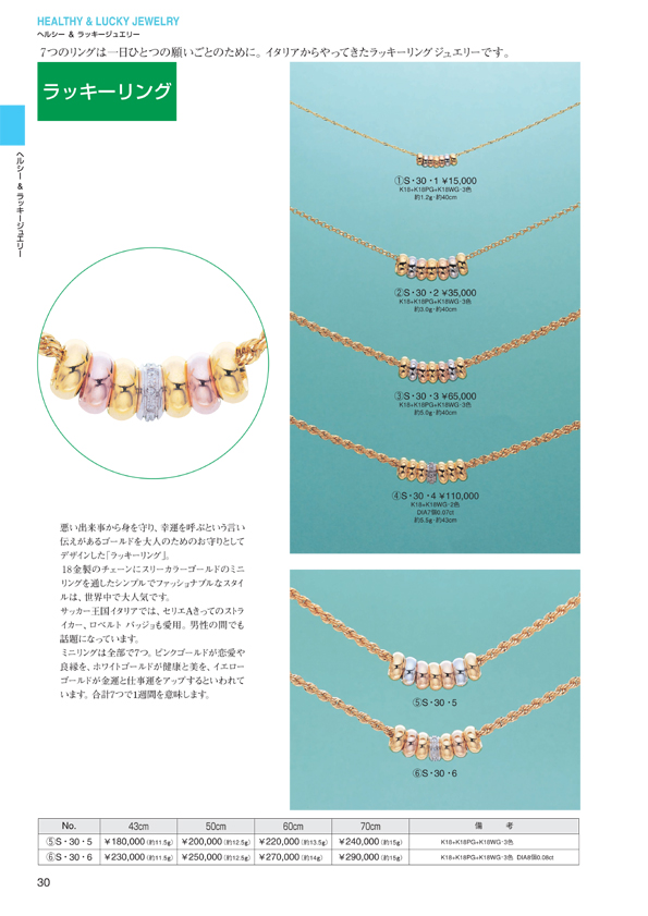 P.0 表紙 P.1 目次(目次一覧↓) ジュエリー イン ファッション ■ Pt スリーストーン ペンダントチェーン ■ K18WG スリーストーン ペンダントチェーン ■ レーザーホールダイヤモンド ペンダントチェーン ■ ダイヤモンドハイジュエリー ■ ジュエリーインファッション ■ ヘルシー&ラッキージュエリー P.22 シルバーゲルマニウム ネックレス&ブレスレット P.23 ゲルマニウム・プレーティング SVネックレス&ブレスレット P.24 ゲルマニウム・プレーティング SV喜平ネックレス&ブレスレット P.25 ゲルマニウム・プレーティング チタンネックレス P.26 マイナスイオンジュエリー P.27 マイナスイオンジュエリー P.28 エポールK18磁気ネックレス P.29 エポール磁気ブレスレット &ネックレス ピルケース P.30 ラッキーリング ペンダントチェーン P.31 根付け ■ ジュエリー イン ファッション ■ ペア&ポージー ■ ブライダルジュエリー ■ ダイヤモンドデザインリング ■ カラーストーンデザインリング ■ デザインリング ■ カラーストーンジュエリー ■ パールジュエリー ■ ピアス ■ イヤリング ■ ブローチ ■ ネックレス&ブレスレット ■ メンズジュエリー
