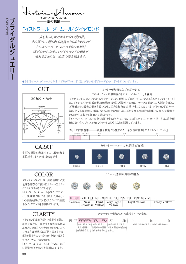 P.0 表紙 P.1 目次(目次一覧↓) ジュエリー イン ファッション ■ Pt スリーストーン ペンダントチェーン ■ K18WG スリーストーン ペンダントチェーン ■ レーザーホールダイヤモンド ペンダントチェーン ■ ダイヤモンドハイジュエリー ■ ジュエリーインファッション ■ ヘルシー&ラッキージュエリー ■ ジュエリー イン ファッション ■ ペア&ポージー ■ ブライダルジュエリー P.38 【イストワール・ダ・ムール】 ダイヤモンド エンゲージリング P.39 ↑つづき P.40 ↑つづき P.41 ↑つづき P.42 ↑つづき P.43 ↑つづき P.44 ピンクダイヤモンド エンゲージリング プチ・イストワールダムール エンゲージリング P.45 ブライダルペンダントチェーン ニューマリッジリング P.46 ジェムストーンマリッジリング P.47 Pt950イストワールダムール マリッジリング P.48 Pt900マリッジリング P.49 Pt1000マリッジリング ■ ダイヤモンドデザインリング ■ カラーストーンデザインリング ■ デザインリング ■ カラーストーンジュエリー ■ パールジュエリー ■ ピアス ■ イヤリング ■ ブローチ ■ ネックレス&ブレスレット ■ メンズジュエリー