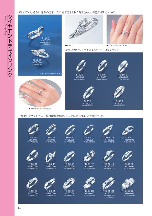 P.0 表紙 P.1 目次(目次一覧↓) ジュエリー イン ファッション ■ Pt スリーストーン ペンダントチェーン ■ K18WG スリーストーン ペンダントチェーン ■ レーザーホールダイヤモンド ペンダントチェーン ■ ダイヤモンドハイジュエリー ■ ジュエリーインファッション ■ ヘルシー&ラッキージュエリー ■ ジュエリー イン ファッション ■ ペア&ポージー ■ ブライダルジュエリー ■ ダイヤモンドデザインリング P.50 プラチナダイヤモンド リング P.51 プラチナダイヤモンドリング P.52 プラチナダイヤモンドリング P.53 コンビダイヤモンドリング P.54 コンビダイヤモンドリング P.55 コンビダイヤモンドリング P.56 ダイヤモンド・ドット・リング P.57 ファンシーカット &カラーダイヤモンド P.58 ダイヤモンドモチーフ &パヴェリング P.59 ダイヤモンドモチーフ &パヴェリング P.60 ツーポイントセッティング P.61 スイートテン エタニティ P.62 ゴージャス P.63 ゴージャス ■ カラーストーンデザインリング ■ デザインリング ■ カラーストーンジュエリー ■ パールジュエリー ■ ピアス ■ イヤリング ■ ブローチ ■ ネックレス&ブレスレット ■ メンズジュエリー