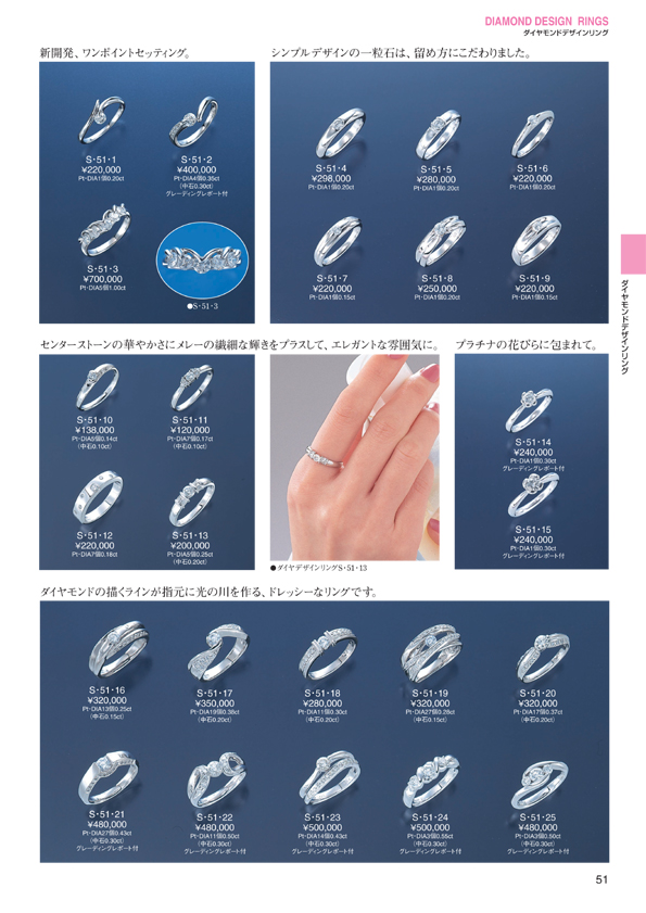 P.0 表紙 P.1 目次(目次一覧↓) ジュエリー イン ファッション ■ Pt スリーストーン ペンダントチェーン ■ K18WG スリーストーン ペンダントチェーン ■ レーザーホールダイヤモンド ペンダントチェーン ■ ダイヤモンドハイジュエリー ■ ジュエリーインファッション ■ ヘルシー&ラッキージュエリー ■ ジュエリー イン ファッション ■ ペア&ポージー ■ ブライダルジュエリー ■ ダイヤモンドデザインリング P.50 プラチナダイヤモンドリング P.51 プラチナダイヤモンド リング P.52 プラチナダイヤモンドリング P.53 コンビダイヤモンドリング P.54 コンビダイヤモンドリング P.55 コンビダイヤモンドリング P.56 ダイヤモンド・ドット・リング P.57 ファンシーカット &カラーダイヤモンド P.58 ダイヤモンドモチーフ &パヴェリング P.59 ダイヤモンドモチーフ &パヴェリング P.60 ツーポイントセッティング P.61 スイートテン エタニティ P.62 ゴージャス P.63 ゴージャス ■ カラーストーンデザインリング ■ デザインリング ■ カラーストーンジュエリー ■ パールジュエリー ■ ピアス ■ イヤリング ■ ブローチ ■ ネックレス&ブレスレット ■ メンズジュエリー