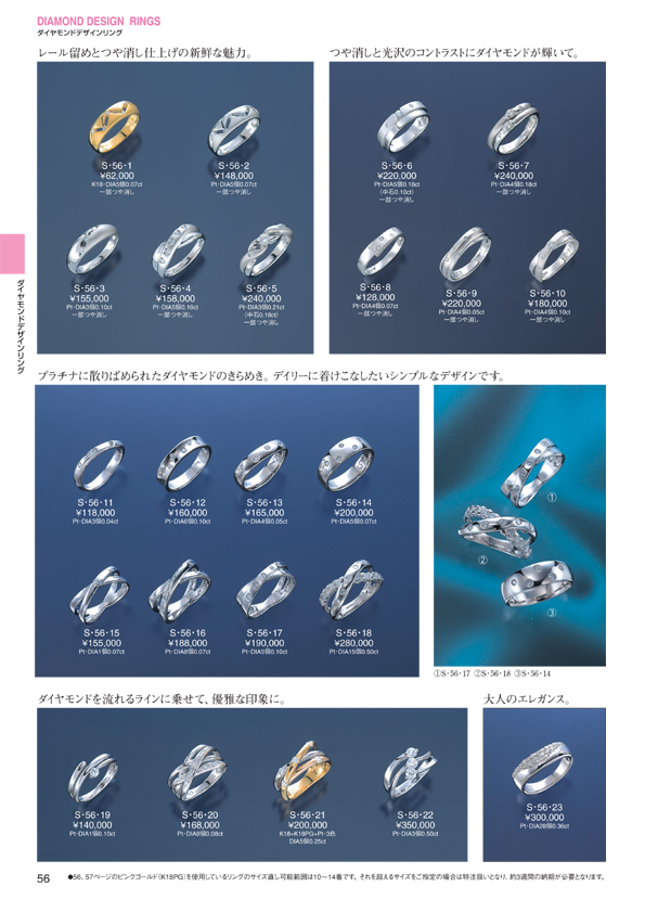 P.0 表紙 P.1 目次(目次一覧↓) ジュエリー イン ファッション ■ Pt スリーストーン ペンダントチェーン ■ K18WG スリーストーン ペンダントチェーン ■ レーザーホールダイヤモンド ペンダントチェーン ■ ダイヤモンドハイジュエリー ■ ジュエリーインファッション ■ ヘルシー&ラッキージュエリー ■ ジュエリー イン ファッション ■ ペア&ポージー ■ ブライダルジュエリー ■ ダイヤモンドデザインリング P.50 プラチナダイヤモンドリング P.51 プラチナダイヤモンドリング P.52 プラチナダイヤモンドリング P.53 コンビダイヤモンドリング P.54 コンビダイヤモンドリング P.55 コンビダイヤモンドリング P.56 ダイヤモンド・ ドット・リング P.57 ファンシーカット &カラーダイヤモンド P.58 ダイヤモンドモチーフ &パヴェリング P.59 ダイヤモンドモチーフ &パヴェリング P.60 ツーポイントセッティング P.61 スイートテン エタニティ P.62 ゴージャス P.63 ゴージャス ■ カラーストーンデザインリング ■ デザインリング ■ カラーストーンジュエリー ■ パールジュエリー ■ ピアス ■ イヤリング ■ ブローチ ■ ネックレス&ブレスレット ■ メンズジュエリー