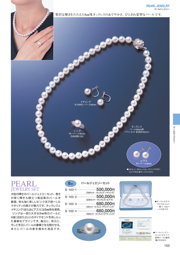 P.0 表紙 P.1 目次(目次一覧↓) ジュエリー イン ファッション ■ Pt スリーストーン ペンダントチェーン ■ K18WG スリーストーン ペンダントチェーン ■ レーザーホールダイヤモンド ペンダントチェーン ■ ダイヤモンドハイジュエリー ■ ジュエリーインファッション ■ ヘルシー&ラッキージュエリー ■ ジュエリー イン ファッション ■ ペア&ポージー ■ ブライダルジュエリー ■ ダイヤモンドデザインリング ■ カラーストーンデザインリング ■ デザインリング ■ カラーストーンジュエリー ■ パールジュエリー P.86 パールジュエリー P.87 パールペンダントチェーン P.88 カラー淡水パールジュエリー P.89 パールピアス&イヤリング P.90 K18パールジュエリー P.91 K18パールジュエリー P.92 マベパールジュエリー P.93 マベパールジュエリー P.94 パールブローチ P.95 パールブローチ P.96 黒蝶真珠ジュエリー P.97 黒蝶真珠ブローチ P.98 花珠パールジュエリー2点セット P.99 グレーパールセット P.100 パールジュエリーセット P.101 パールジュエリーセット P.102 パールジュエリーセット P.103 パール ジュエリーセット P.104 「留花(ルカ)」パールセット P.105 「留花(ルカ)」グレーパールセット ■ ピアス ■ イヤリング ■ ブローチ ■ ネックレス&ブレスレット ■ メンズジュエリー