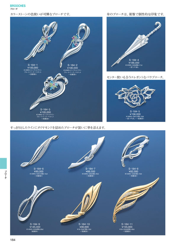 P.0 表紙 P.1 目次(目次一覧↓) ジュエリー イン ファッション ■ Pt スリーストーン ペンダントチェーン ■ K18WG スリーストーン ペンダントチェーン ■ レーザーホールダイヤモンド ペンダントチェーン ■ ダイヤモンドハイジュエリー ■ ジュエリーインファッション ■ ヘルシー&ラッキージュエリー ■ ジュエリー イン ファッション ■ ペア&ポージー ■ ブライダルジュエリー ■ ダイヤモンドデザインリング ■ カラーストーンデザインリング ■ デザインリング ■ カラーストーンジュエリー ■ パールジュエリー ■ ピアス ■ イヤリング ■ ブローチ P.180 カメオ P.181 カメオ P.182 平戸 P.183 平戸 パール スリーカラー P.184 カラーストーン ダイヤモンド P.185 アニマル P.186 デザインブローチ P.187 デザインブローチ P.188 ミニブローチ 蝶 P.189 ピンブローチ イニシャル ■ ネックレス&ブレスレット ■ メンズジュエリー
