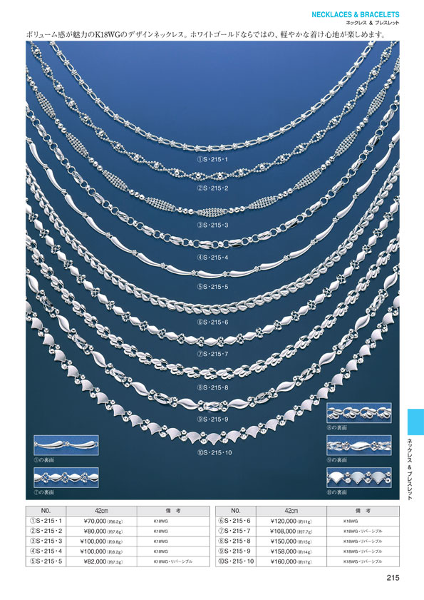 P.0 表紙 P.1 目次(目次一覧↓) ジュエリー イン ファッション ■ Pt スリーストーン ペンダントチェーン ■ K18WG スリーストーン ペンダントチェーン ■ レーザーホールダイヤモンド ペンダントチェーン ■ ダイヤモンドハイジュエリー ■ ジュエリーインファッション ■ ヘルシー&ラッキージュエリー ■ ジュエリー イン ファッション ■ ペア&ポージー ■ ブライダルジュエリー ■ ダイヤモンドデザインリング ■ カラーストーンデザインリング ■ デザインリング ■ カラーストーンジュエリー ■ パールジュエリー ■ ピアス ■ イヤリング ■ ブローチ ■ ネックレス&ブレスレット P.190 Ptベーシックチェーン P.191 Ptベーシックチェーン P.192 Ptベーシックチェーン P.193 Ptベーシックチェーン P.194 Ptベーシックチェーン P.195 Pt・K18WGベーシックチェーン P.196 Pt・K18WGベーシックチェーン P.197 K18WGベーシックチェーン P.198 K18ベーシックチェーン P.199 K18ベーシックチェーン P.200 K18ベーシックチェーン P.201 K18ベーシックチェーン P.202 K18ベーシックチェーン P.203 K18ベーシックチェーン P.204 K18ベーシックチェーン P.205 K18ベーシックチェーン P.206 オメガネックレス P.207 オメガネックレス P.208 オメガネックレス P.209 オメガネックレス P.210 リバーシブルオメガネックレス P.211 リバーシブルオメガネックレス P.212 Ptデザインネックレス P.213 K18WGベーシックチェーン P.214 Pt・K18WGデザインネックレス P.215 K18WG デザインネックレス P.216 K18WG・K18デザインネックレス P.217 コンビデザインネックレス P.218 コンビデザインネックレス P.219 コンビデザインネックレス P.220 K18デザインネックレス P.221 K18デザインネックレス P.222 K18WGブレスレット P.223 ブレスレット P.224 マグネットYチェーン P.225 マグネットYチェーン P.226 ブレスレット P.227 アンクレット P.228 スライドチェーン P.229 メガネチェーン P.230 K18喜平ネックレス P.231 K18喜平ネックレス P.232 K18喜平ネックレス P.233 K18喜平ネックレス P.234 Pt喜平ネックレス P.235 Pt喜平ネックレス P.236 Pt喜平ネックレス P.237 K18喜平ブレスレット P.238 K18喜平ブレスレット P.239 K18喜平ブレスレット P.240 Pt喜平ブレスレット P.241 Pt喜平ブレスレット ■ メンズジュエリー